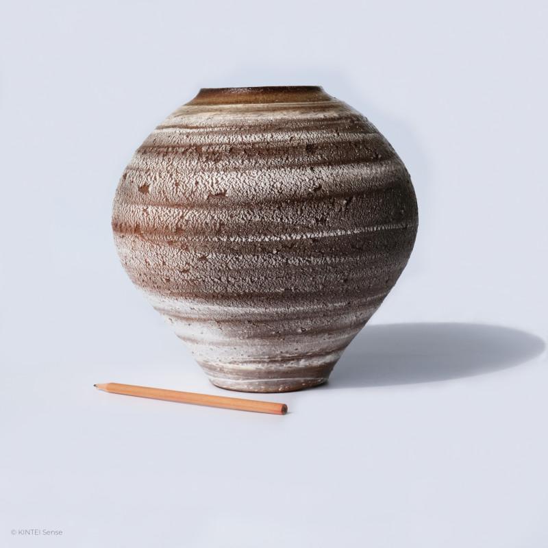 Wie ein Planet scheint diese runde Rahō 螺法 Vase von Ishida Kazuya durch den Raum zu schweben. Die spiralförmigen Linien in kontrastierenden Farben verleihen ihr eine fast ephemere, schwerelos wirkende Präsenz. Der Rahō-Stil, inspiriert von Ishidas Zeit in England, entfaltet sich hier in besonderer Klarheit: durch die zentrifugale Bewegung der Drehscheibe verweben sich Engobe und eisenhaltiger Bizen-Ton zu einem lebendigen Geflecht.