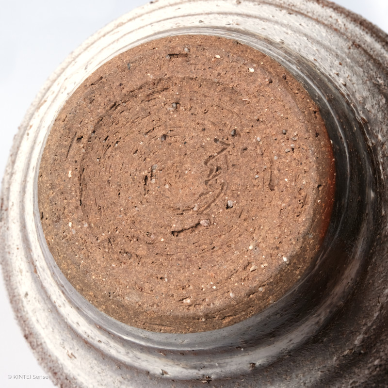Die unglasierte Oberfläche macht den Charakter, oder Geschmack, des Tons unmittelbar erfahrbar. Er zeigt sich rau, erdig und von besonderer haptischer Qualität. Spuren des Feuers aus dem Anagama-Holzbrand sind ebenso erkennbar: eine leicht verdunkelte Partie verweist auf den Rauchpfad im Brand, während natürliche Ascheglasur feinen Glanz hervorbringt.