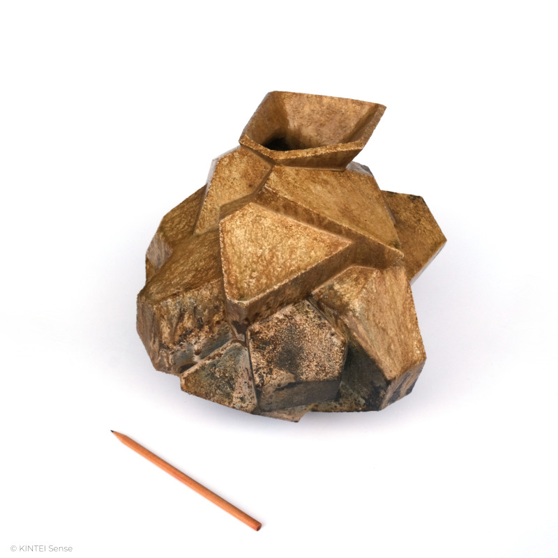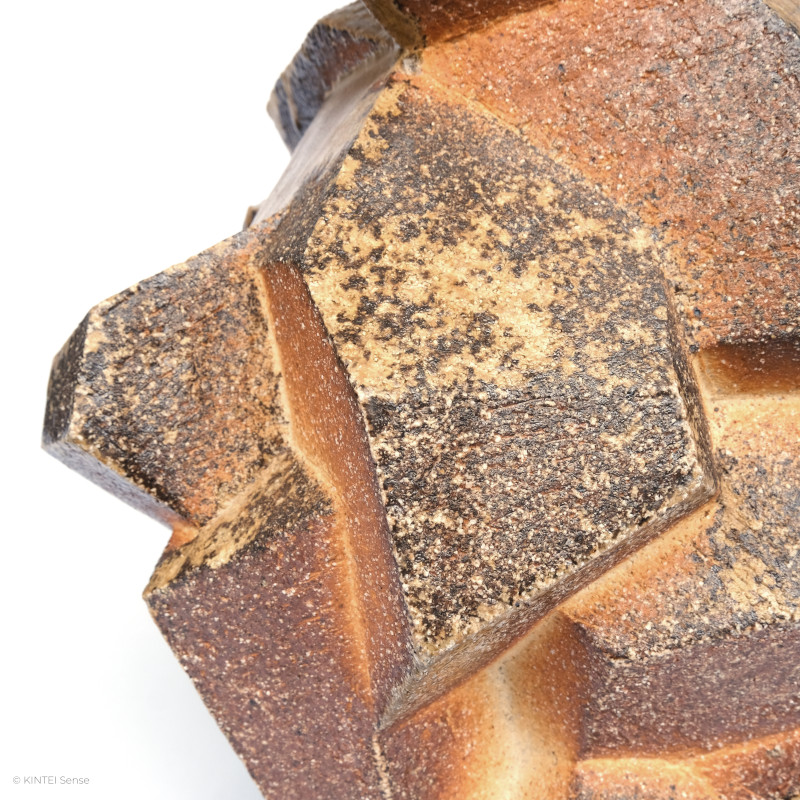 Entstanden aus Shigaraki-Ton im Holzbrand, zeigt die Arbeit deutliche Yōhen (窯変)-Effekte. Der Ascheanflug ist stark ausgeprägt und legt sich wie eine eruptive Schicht über die Oberfläche. In Bereichen intensiver Hitzeentwicklung tritt zudem Koge (焦げ), eine leichte Verkohlung, sichtbar hervor.